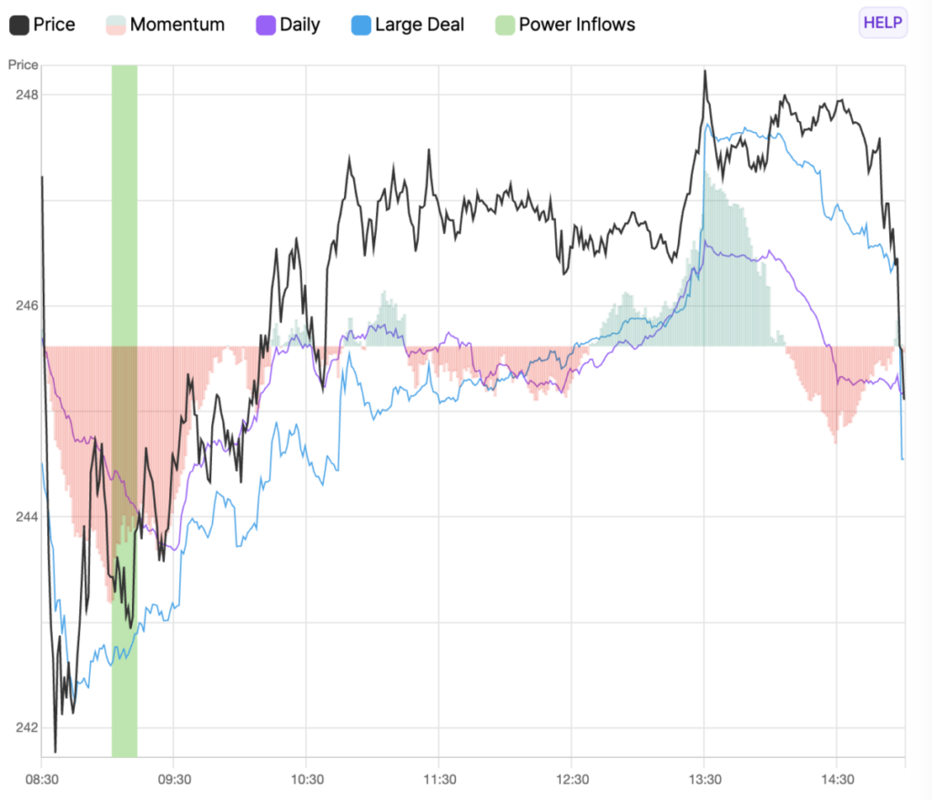 Today, at 10:11 AM on July 17th, a significant trading signal occurred for Taiwan Semiconductor (TSM) as it demonstrated a Power Inflow at a price of $243.05. This indicator is crucial for traders who want to know directionally where institutions and so-called “smart money” moves in the market. They see the value of utilizing order flow analytics to guide their trading decisions. The Power Inflow points to a possible uptrend in TSM’s stock, marking a potential entry point for traders looking to capitalize on the expected upward movement. Traders with this signal closely watch for sustained momentum in TSM’s stock price, interpreting this event as a bullish sign.